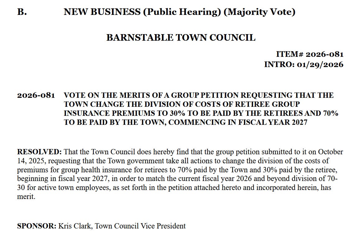 Backstory: A petition was submitted requesting the Council consider increasing the town’s contributions to retiree health insurance from 50% to 70%. The Town Council authorized increasing town contributions for employee health insurance premiums up to 70% in 2023.